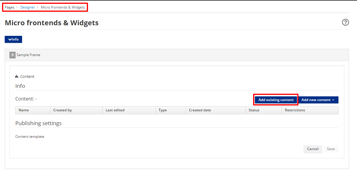 <@wp.show frame=0 />, where frame is the pos variable from theJSON configuration.<#assign wp=JspTaglibs["/aps-core"]>is required at the top of the template to setup thewpvariable. - Common code can be shared across pages by using UX Fragments and